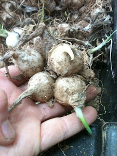 In our down time this week we busied ourselves prepping onion and garlic seed by separated the bunching onions and garlic cloves .