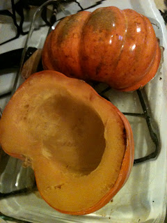 Bake in a casserole dish for about 45 minutes depending on the size of the pumpkin. I had two different sizes so the small one was done quicker. When it is done you should be able to pierce the meat easily with a fork.
